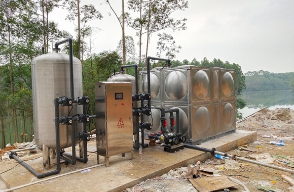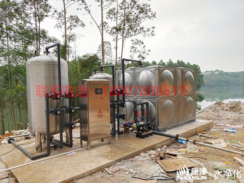 項目名稱:來賓市武宣縣河水凈化工程 設備名稱:10噸河水壓力式凈水設備 工藝流程:河水-石英砂過濾器-凈水箱-二氧化氯消毒-加壓泵-高位水塔...